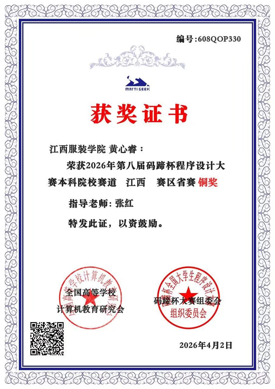 【402cc永利官网讯】2026年4月2日,2026年码蹄杯程序设计大赛省赛第一场获奖名单正式揭晓,402cc永利官网大一学子黄心睿凭借扎实的编程基础、清晰的解题思路和出色的临场发挥,在众多参赛选手中脱颖而出,荣获江西赛区省赛铜奖铜奖,为402cc永利官网再添荣誉。